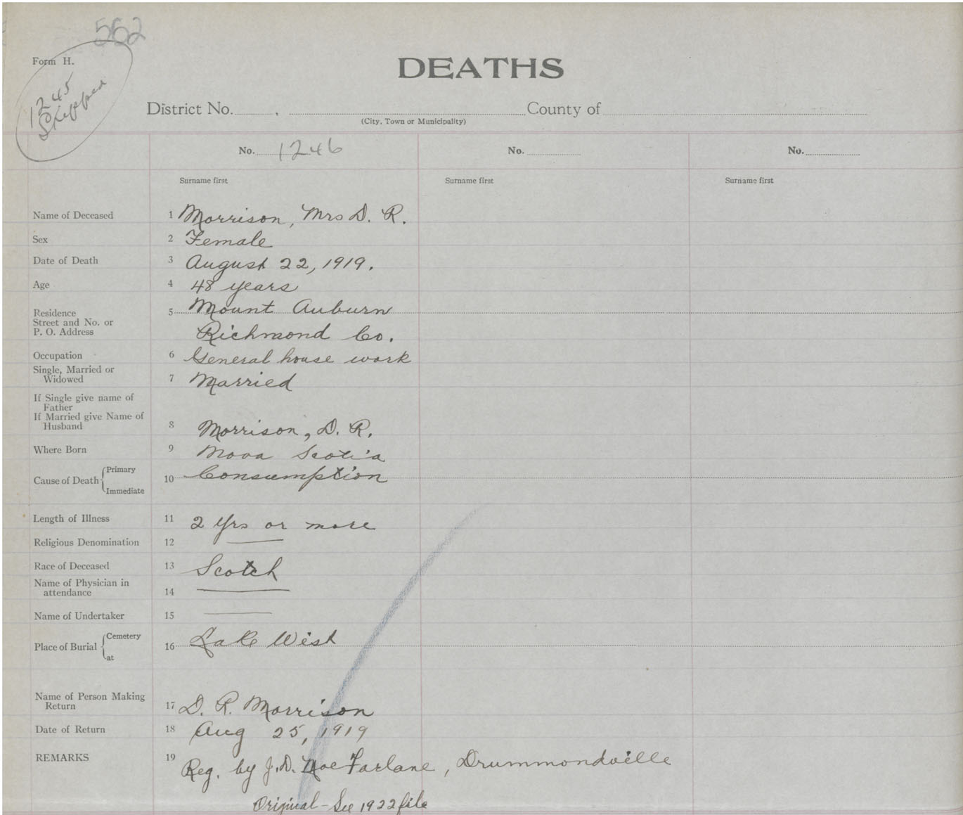Female Death Registration: Year: 1919 book: 47 page: 562 number: 1246