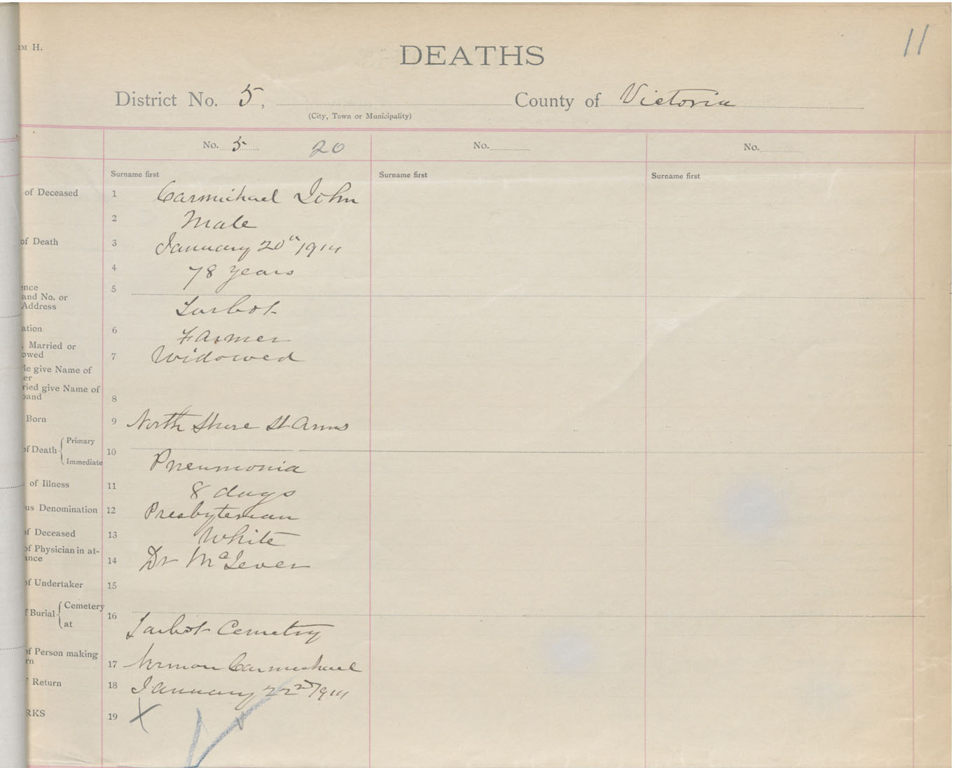 Male Death Registration: Year: 1914 book: 48 page: 11 number: 20