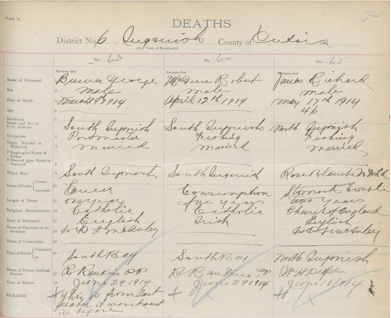 Male Death Registration: Year: 1914 book: 48 page: 27 number: 63