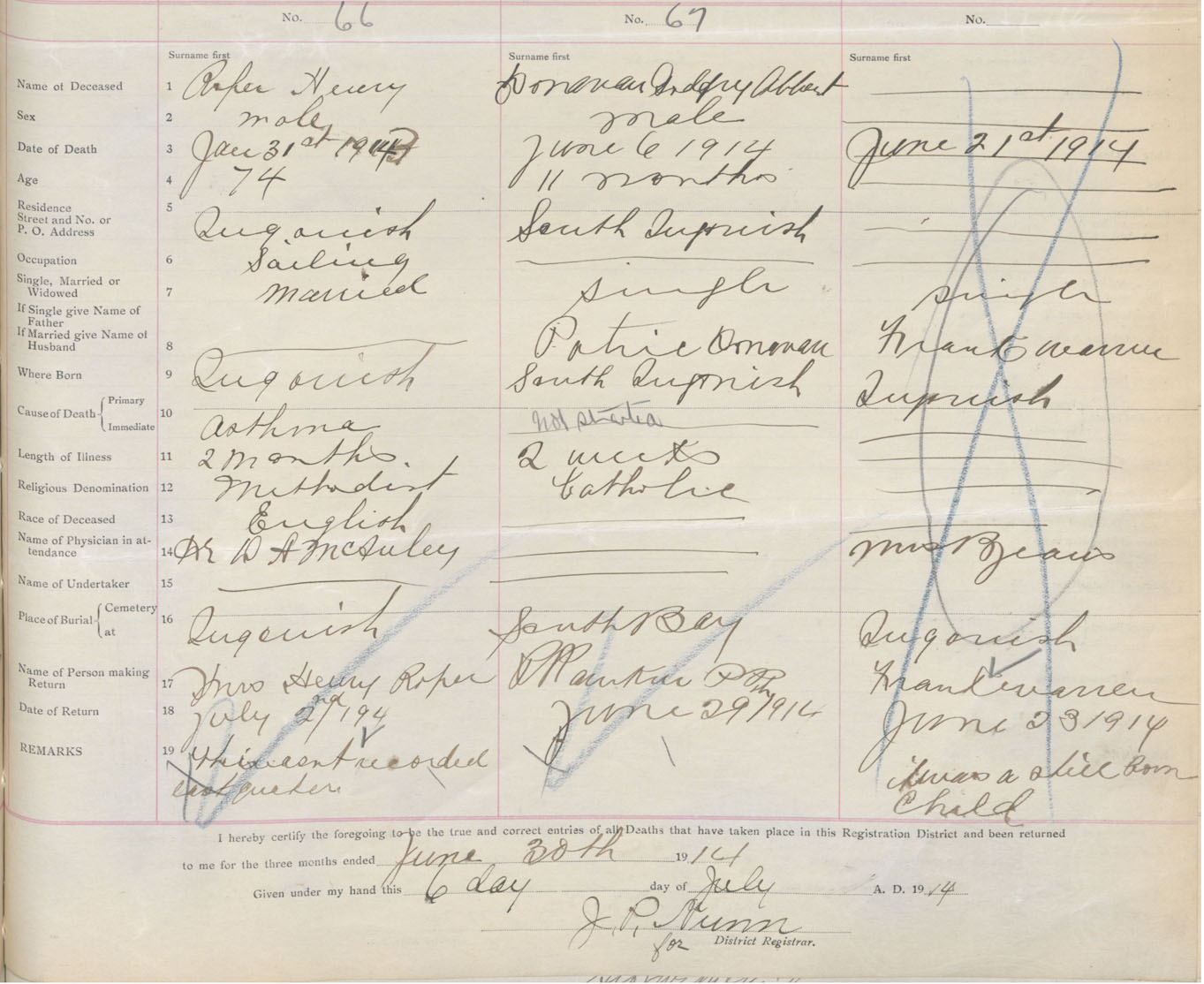 Male Death Registration: Year: 1914 book: 48 page: 27 number: 66