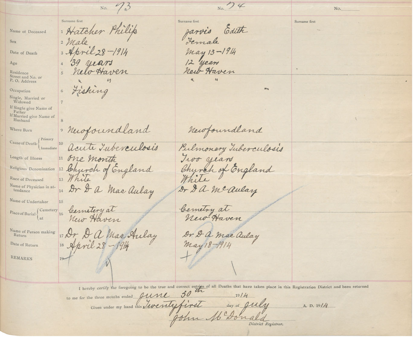 Male Death Registration: Year: 1914 book: 48 page: 29 number: 73