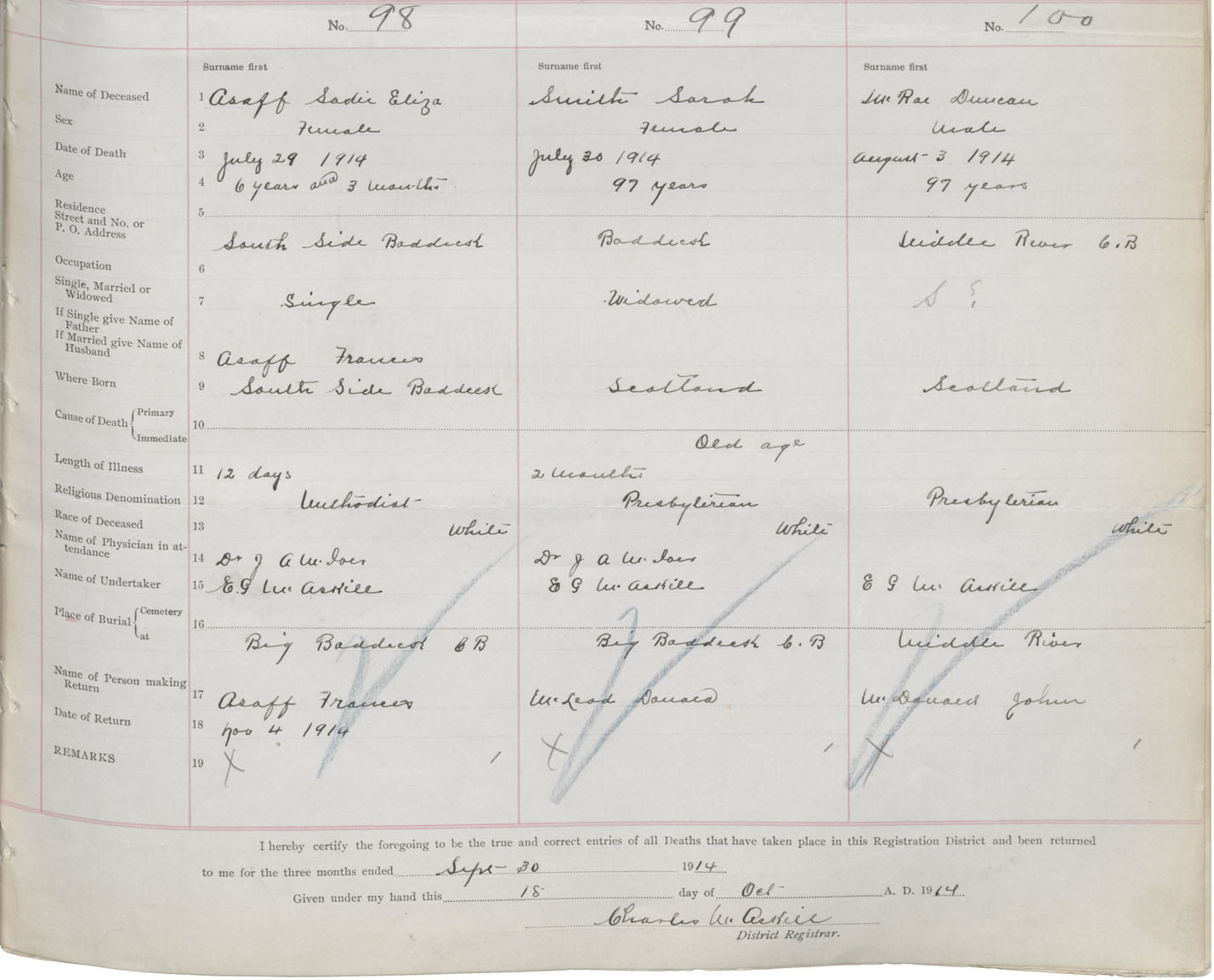 Female Death Registration: Year: 1914 book: 48 page: 39 number: 98