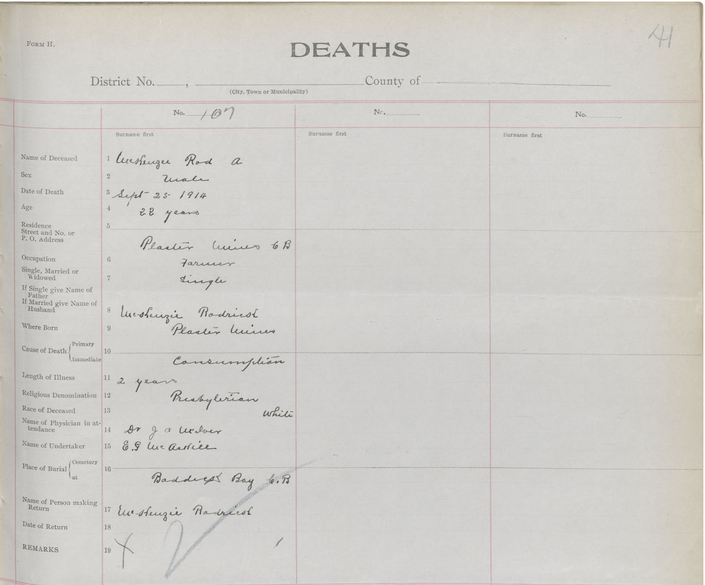 Male Death Registration: Year: 1914 book: 48 page: 41 number: 107