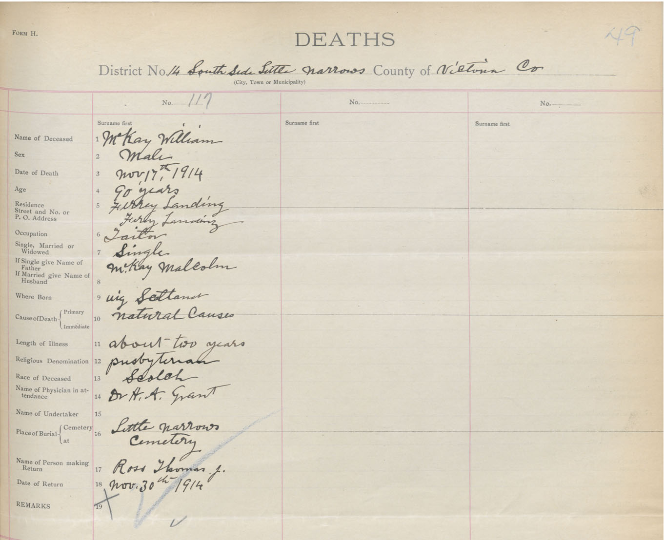Male Death Registration: Year: 1914 book: 48 page: 49 number: 117