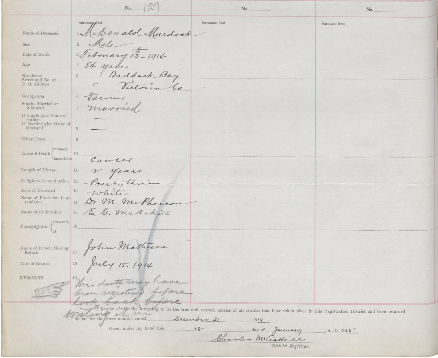 Male Death Registration: Year: 1914 book: 48 page: 52 number: 127