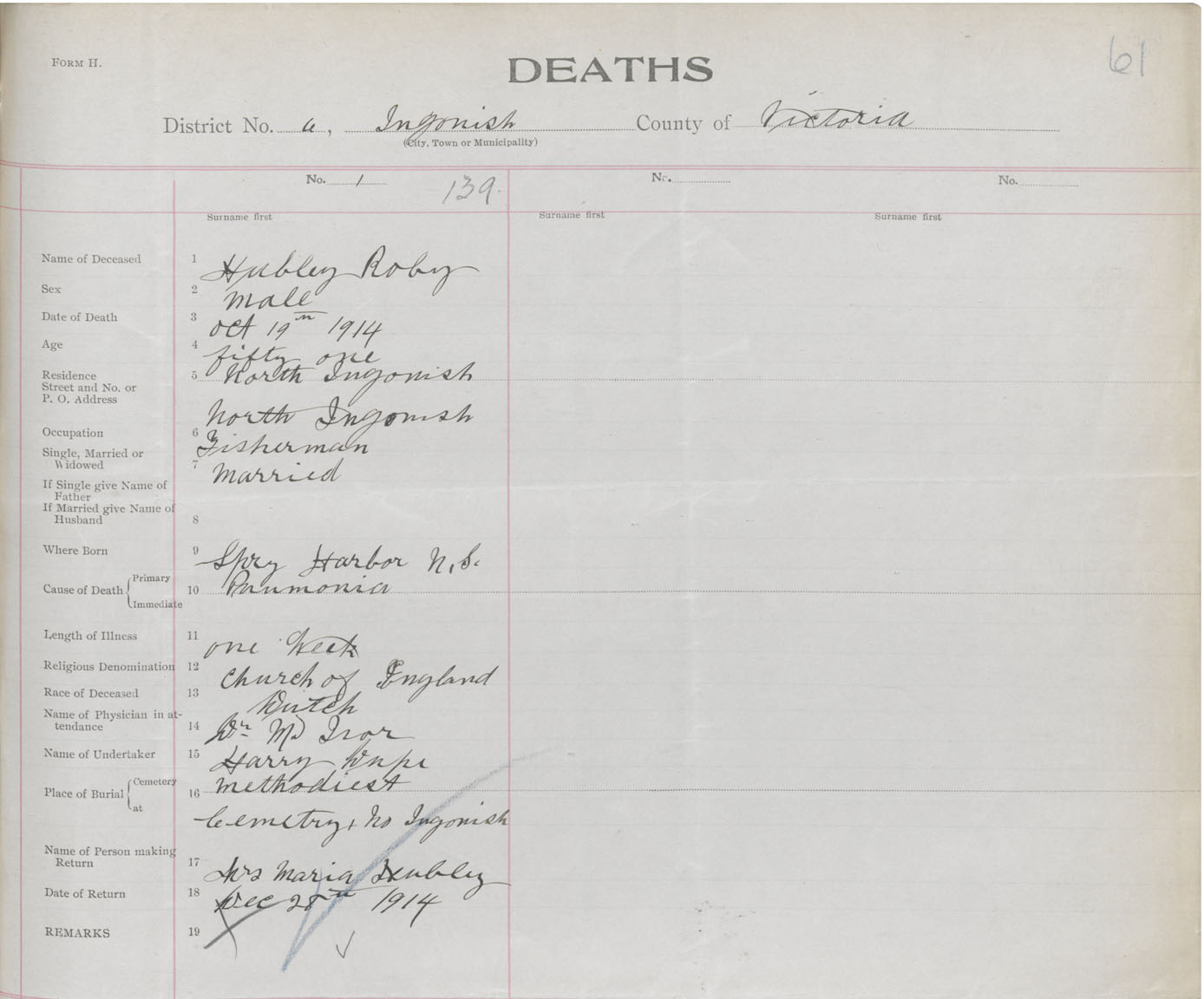 Male Death Registration: Year: 1914 book: 48 page: 61 number: 139