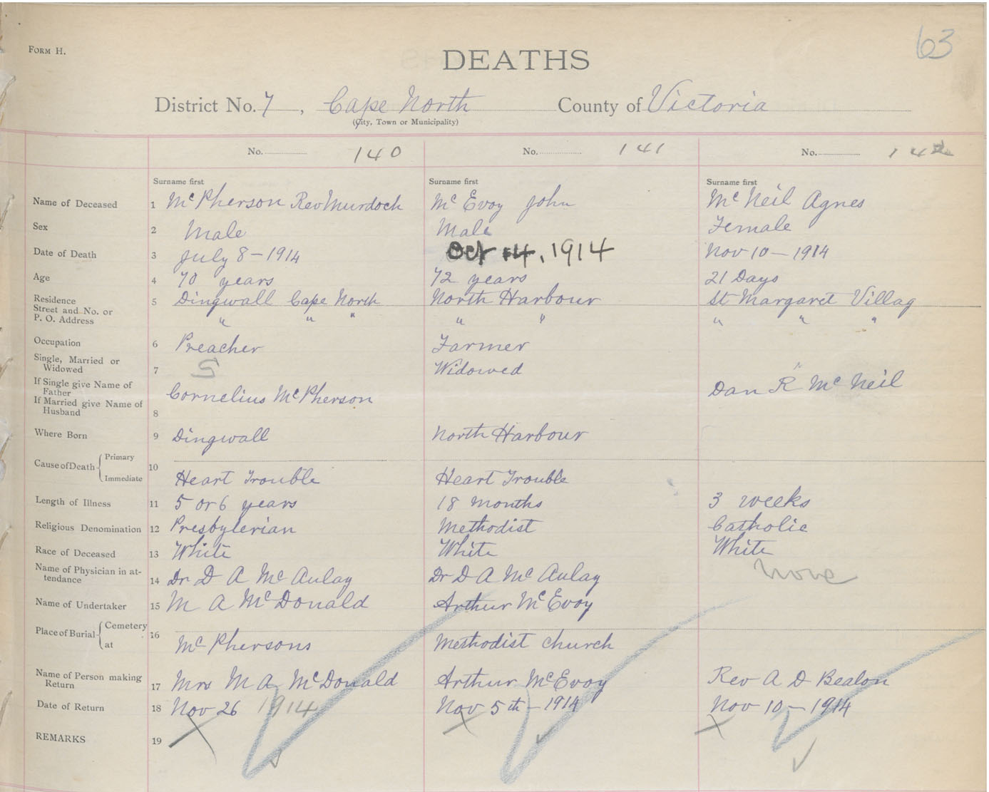 Male Death Registration: Year: 1914 book: 48 page: 63 number: 140