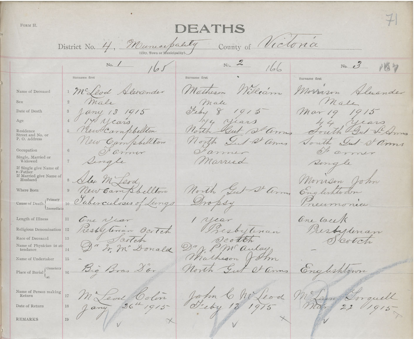 Male Death Registration: Year: 1915 book: 48 page: 71 number: 165