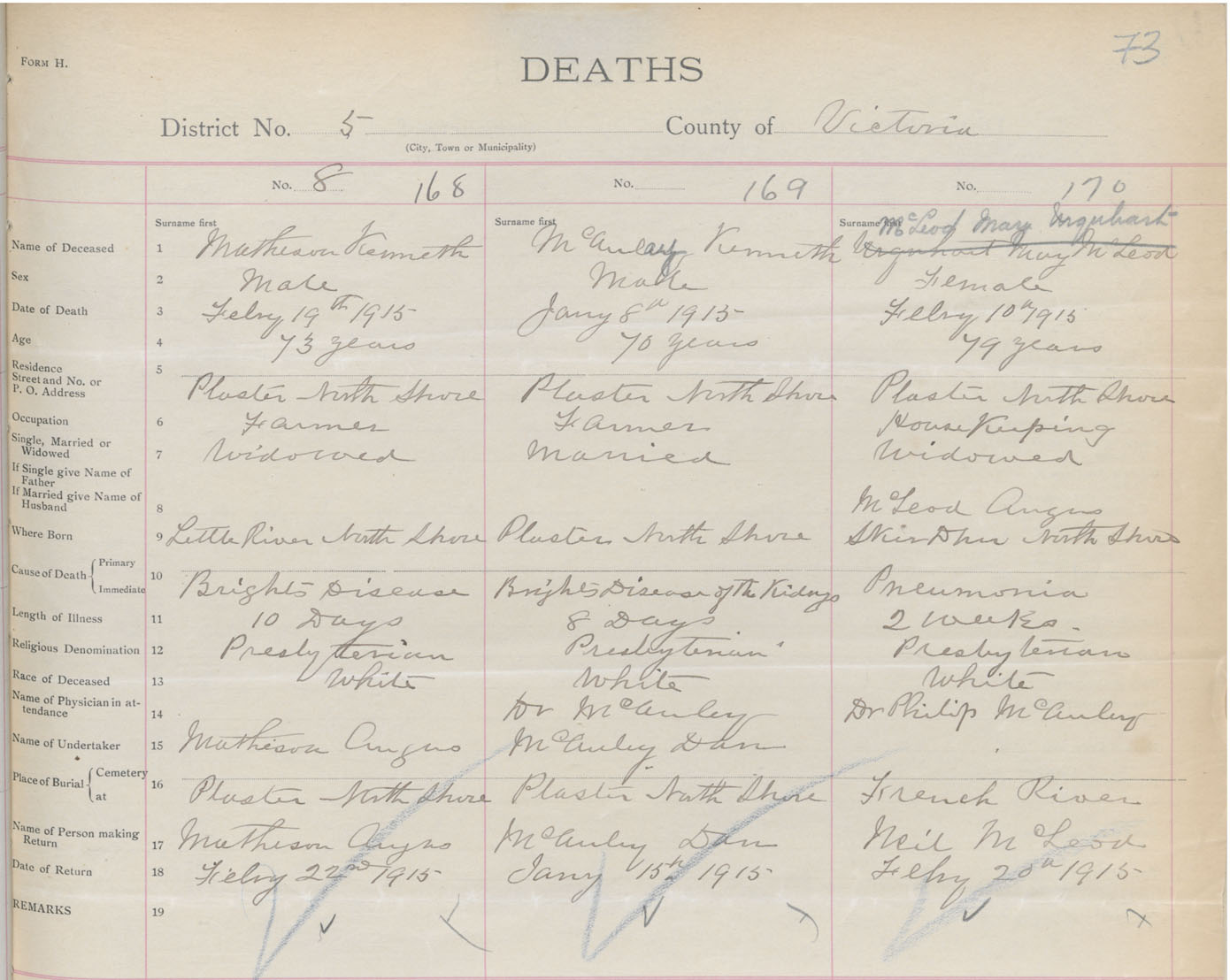 Male Death Registration: Year: 1915 book: 48 page: 73 number: 168