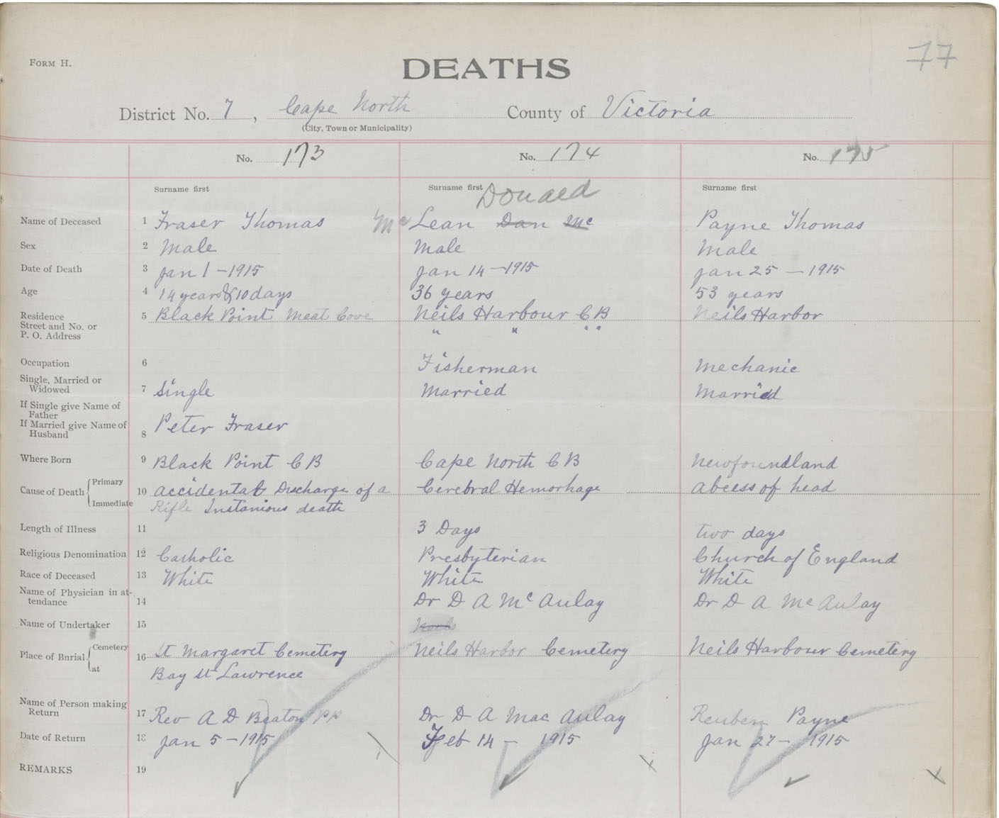 Male Death Registration: Year: 1915 book: 48 page: 77 number: 173