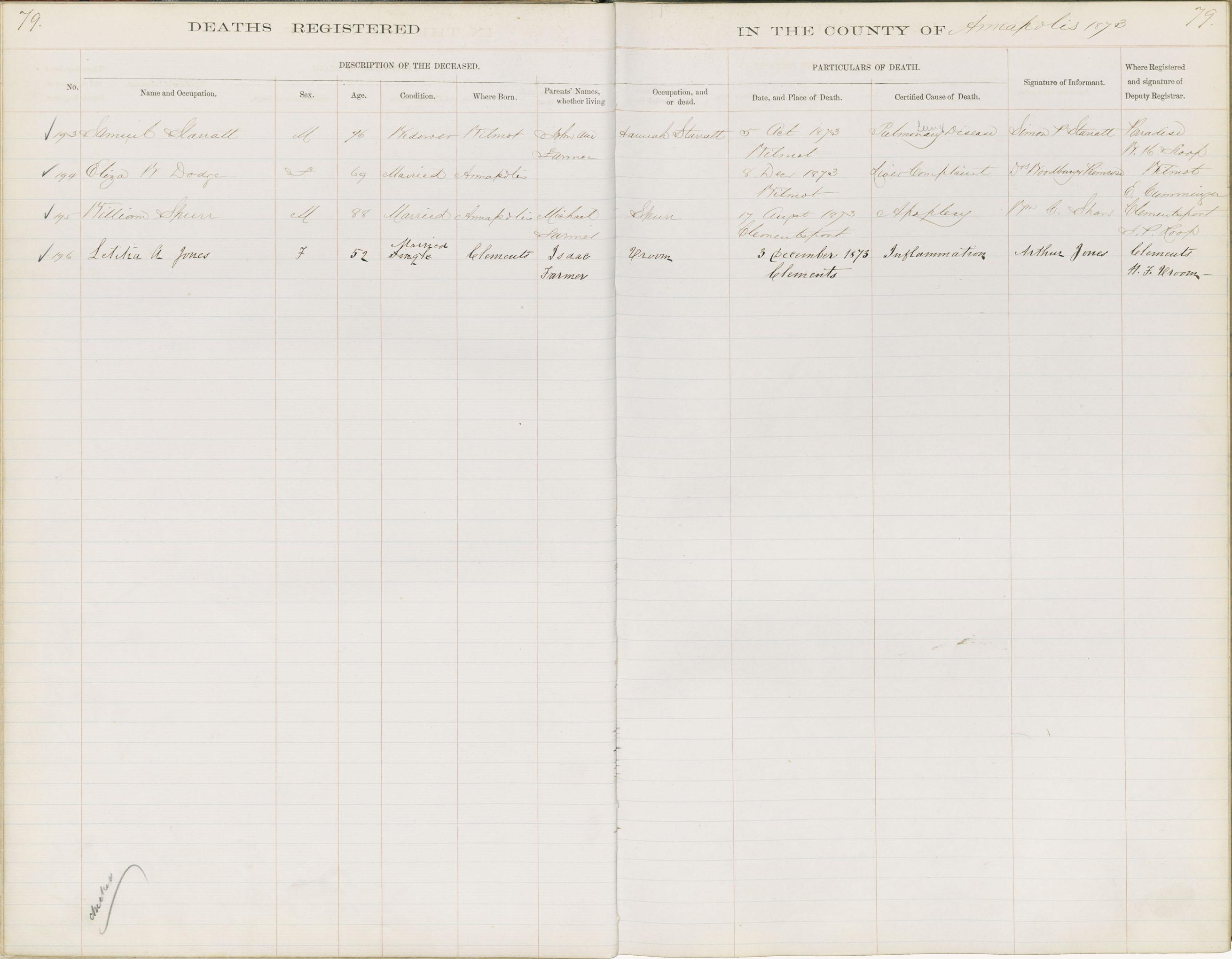 Death Registration: Year: 1873 book: 1801 page: 79 number: 193