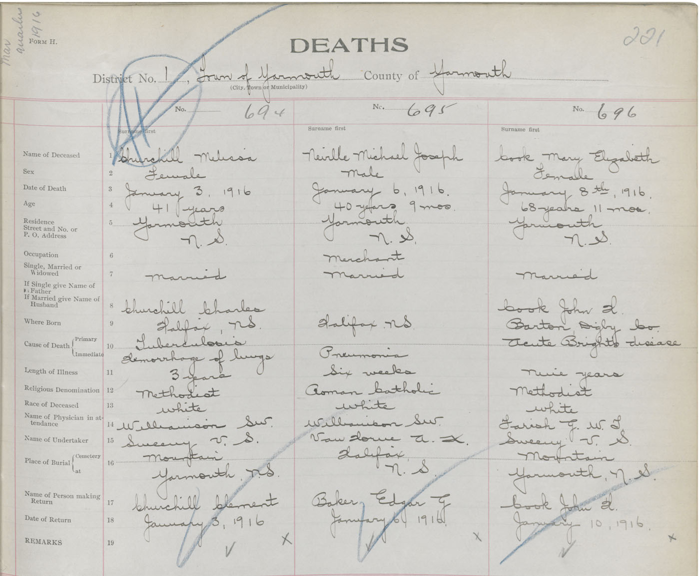 Death Registration: Year: 1916 book: 50 page: 221 number: 696