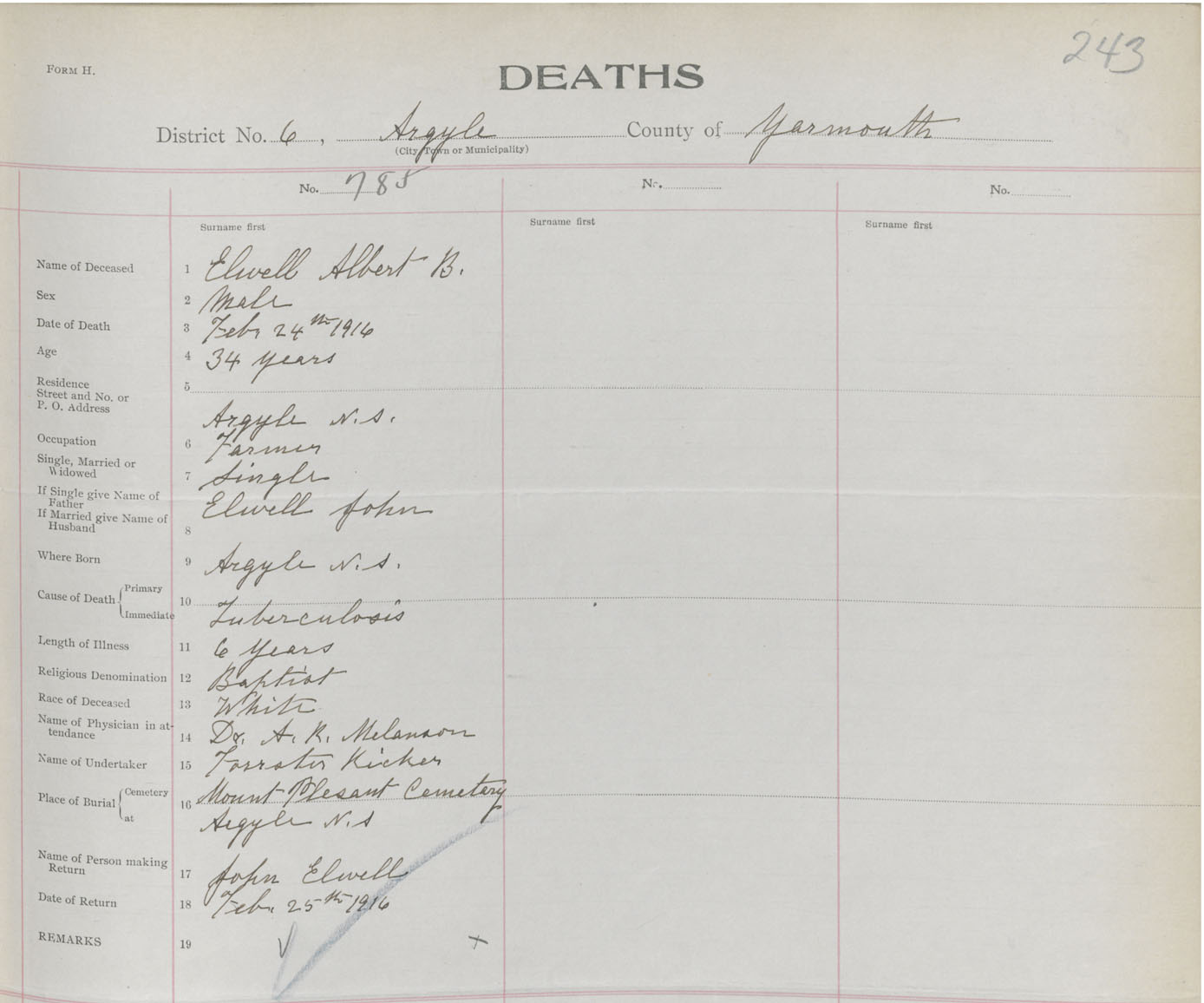 Death Registration: Year: 1916 book: 50 page: 243 number: 785