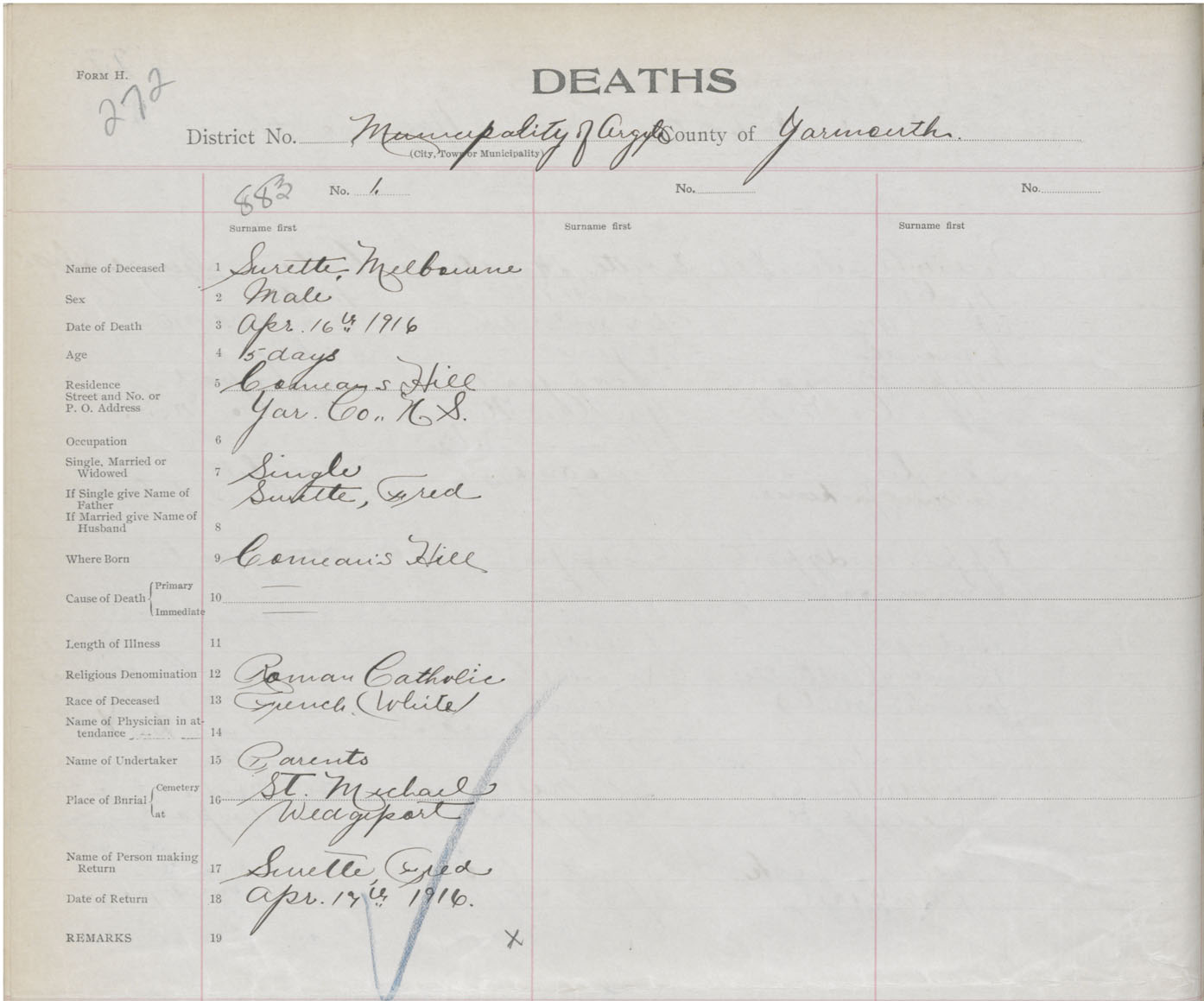 Death Registration: Year: 1916 book: 50 page: 272 number: 883