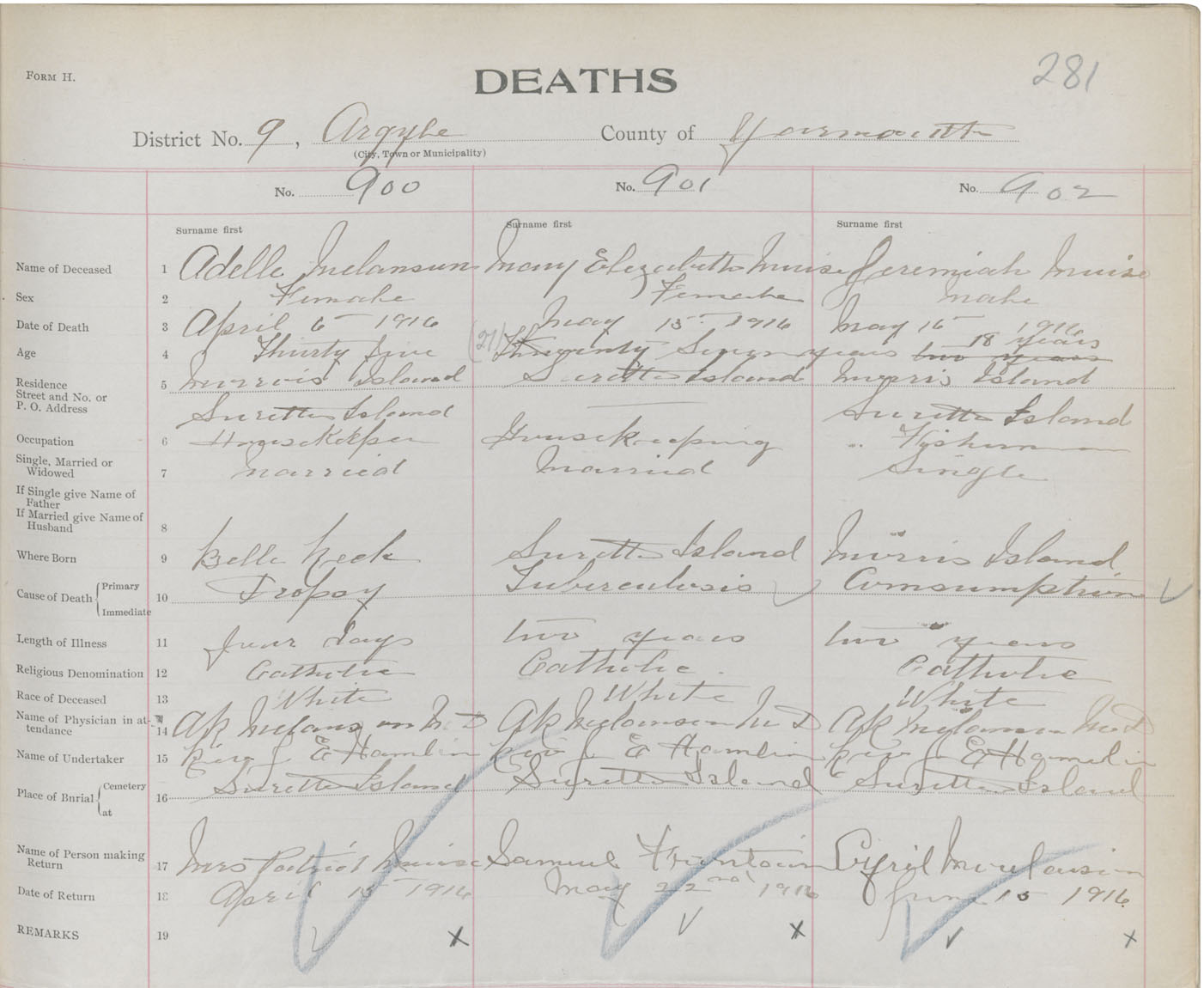 Death Registration: Year: 1916 book: 50 page: 281 number: 900