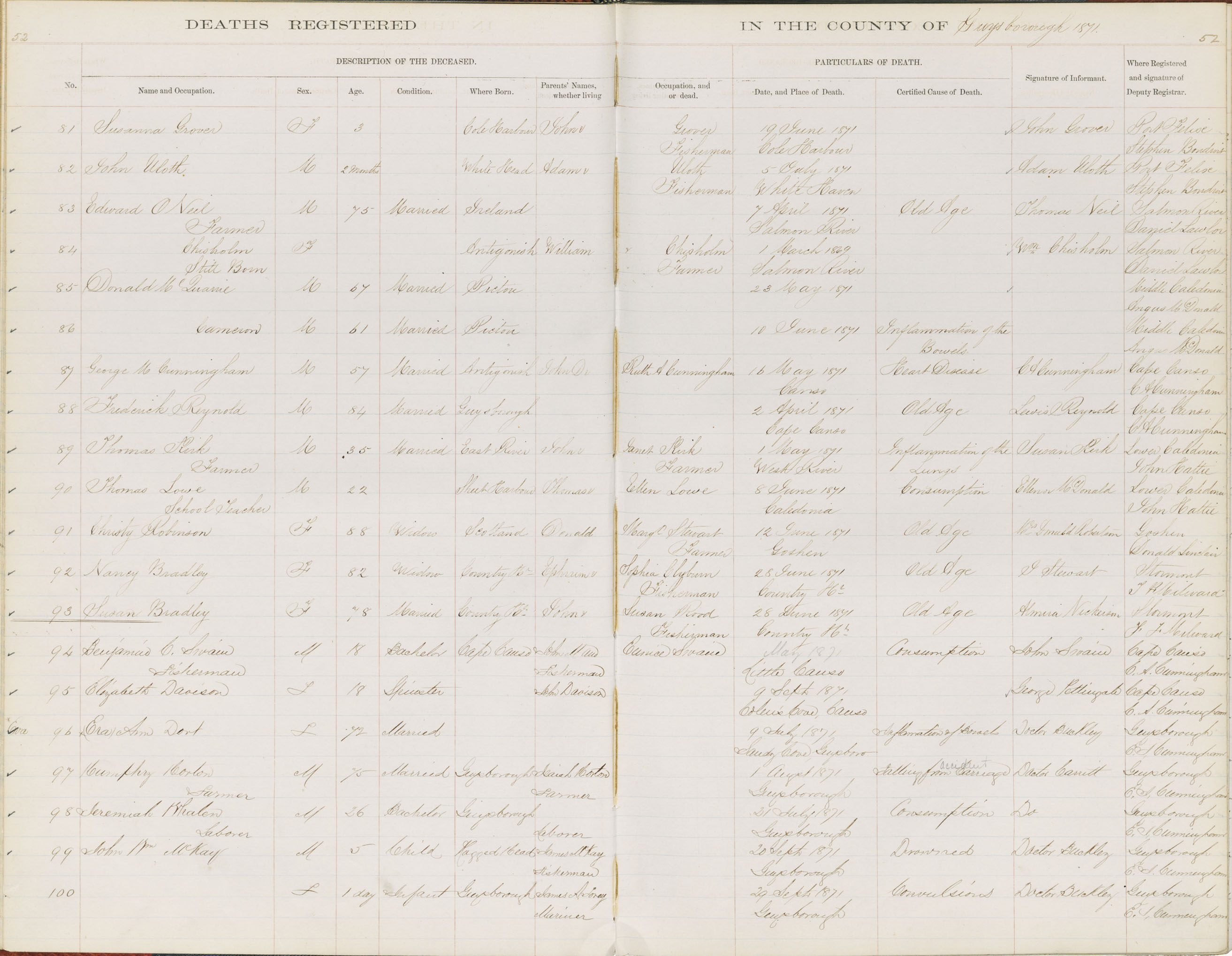 Death Registration: Year: 1871 book: 1807 page: 52 number: 100