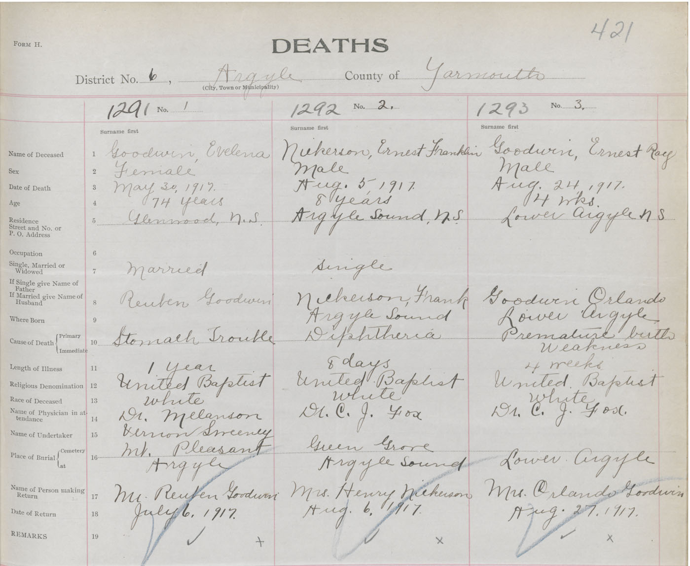 Death Registration: Year: 1917 book: 50 page: 421 number: 1293