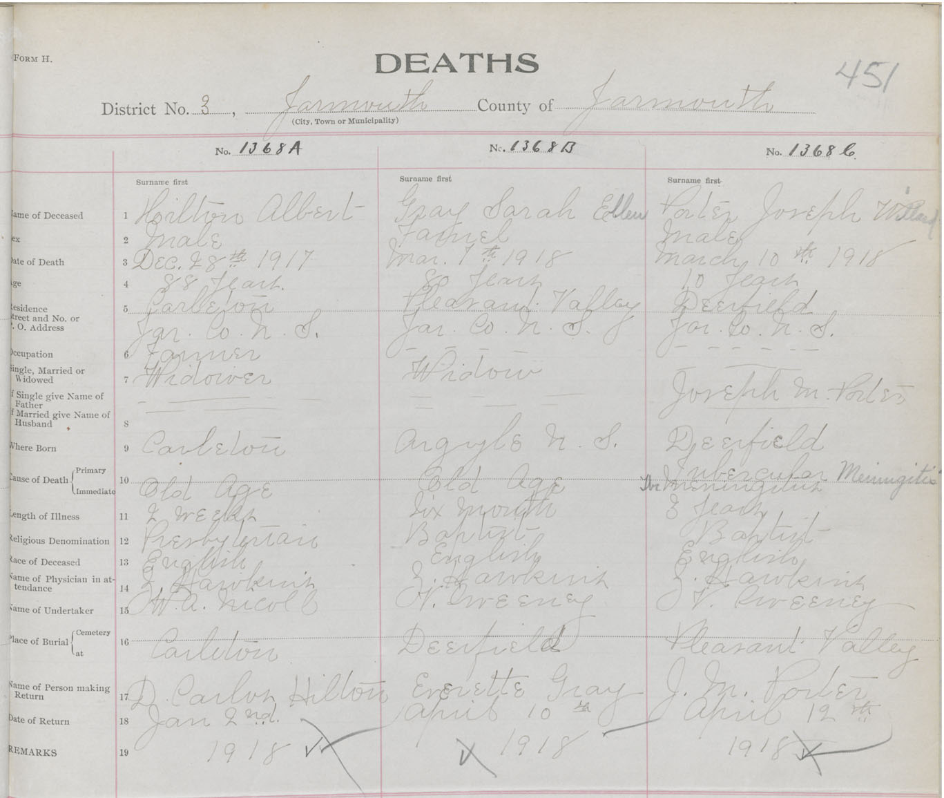 Female Death Registration: Year: 1918 book: 50 page: 451 number: 1368