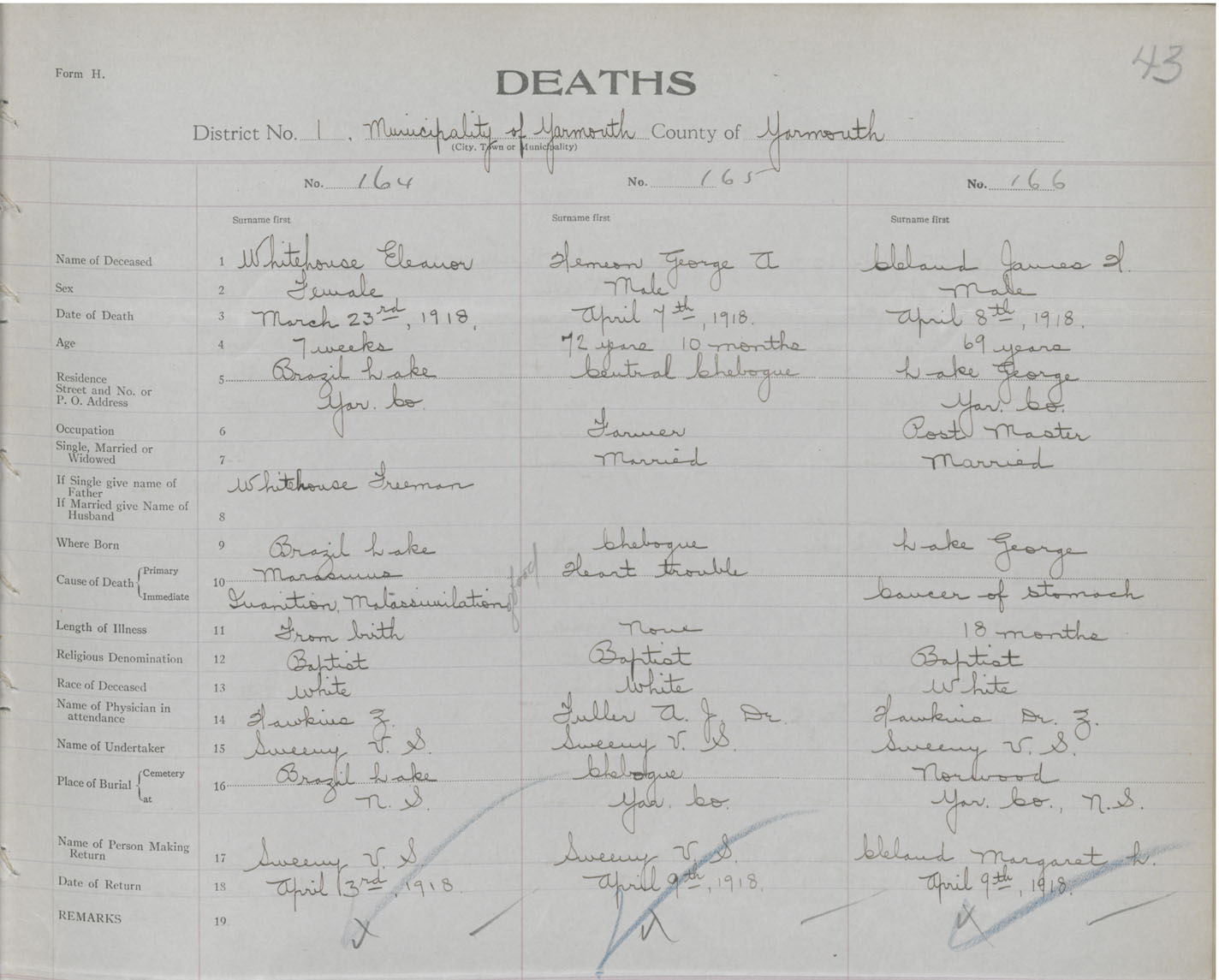Death Registration: Year: 1918 book: 51 page: 43 number: 164