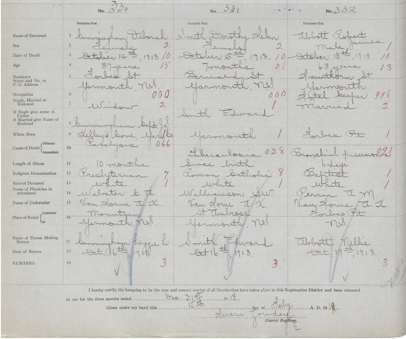 Death Registration: Year: 1918 book: 51 page: 108 number: 332
