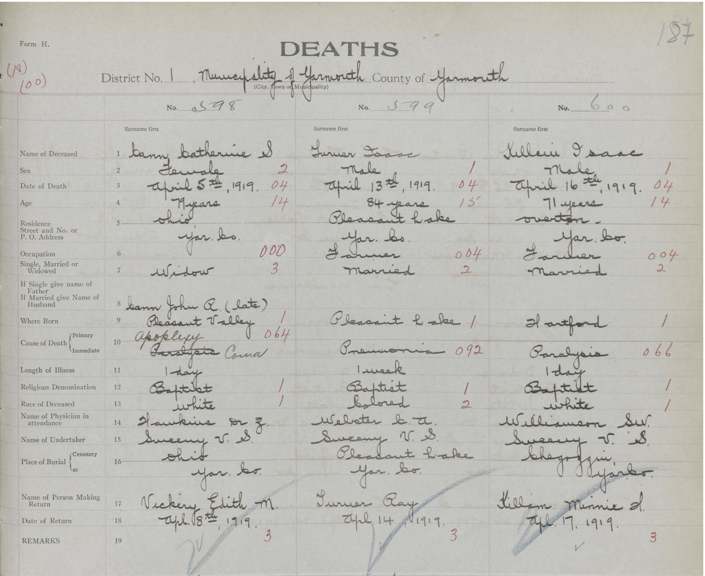 Male Death Registration: Year: 1919 book: 51 page: 187 number: 600