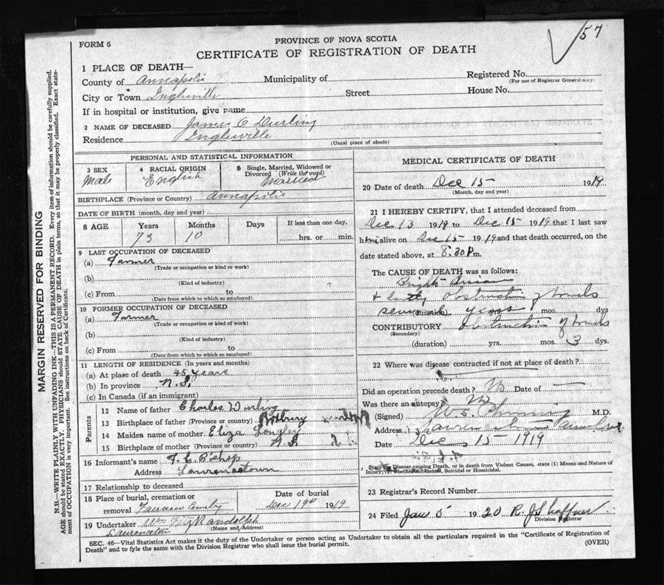 Male Death Registration: Year: 1919 file: 52 number: 57