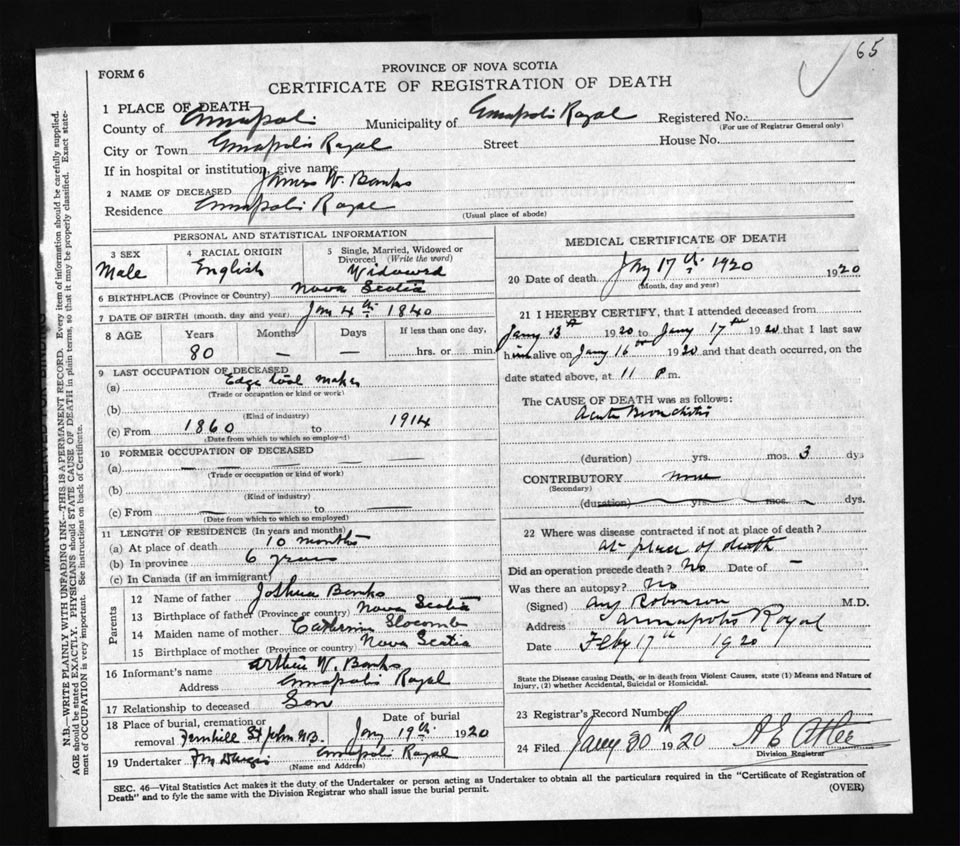 Male Death Registration: Year: 1920 file: 52 number: 65
