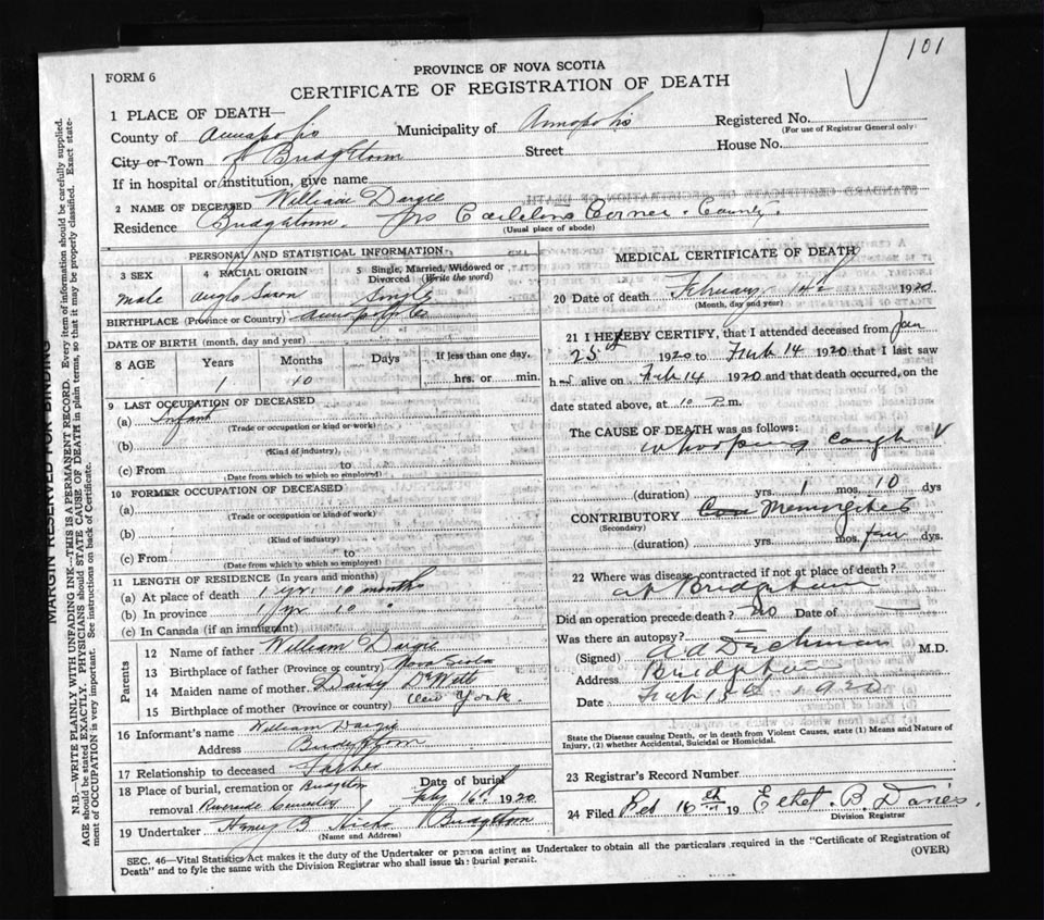 Male Death Registration: Year: 1920 file: 52 number: 101