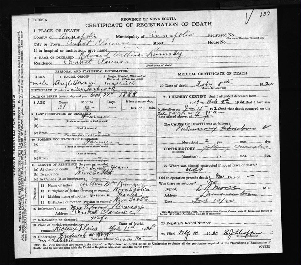 Male Death Registration: Year: 1920 file: 52 number: 107