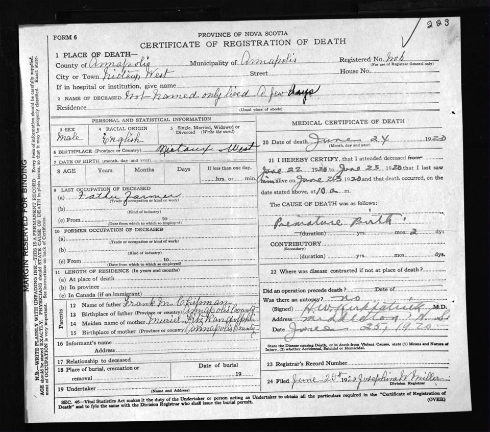 Male Death Registration: Year: 1920 file: 52 number: 223