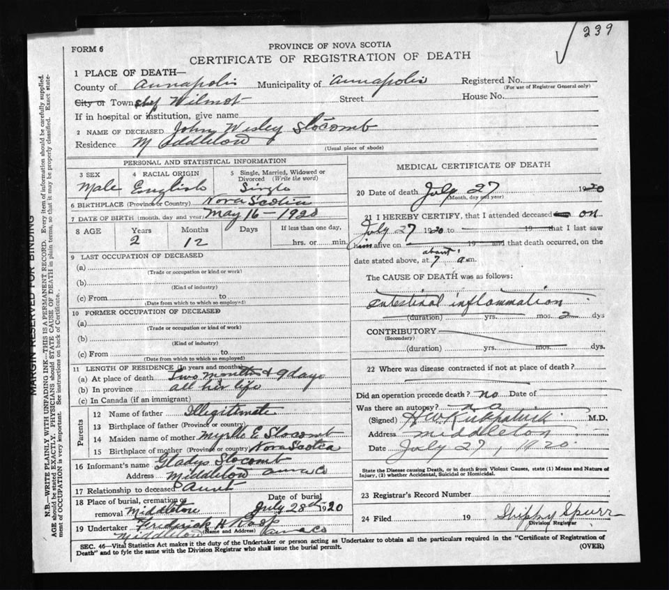 Male Death Registration: Year: 1920 file: 52 number: 239