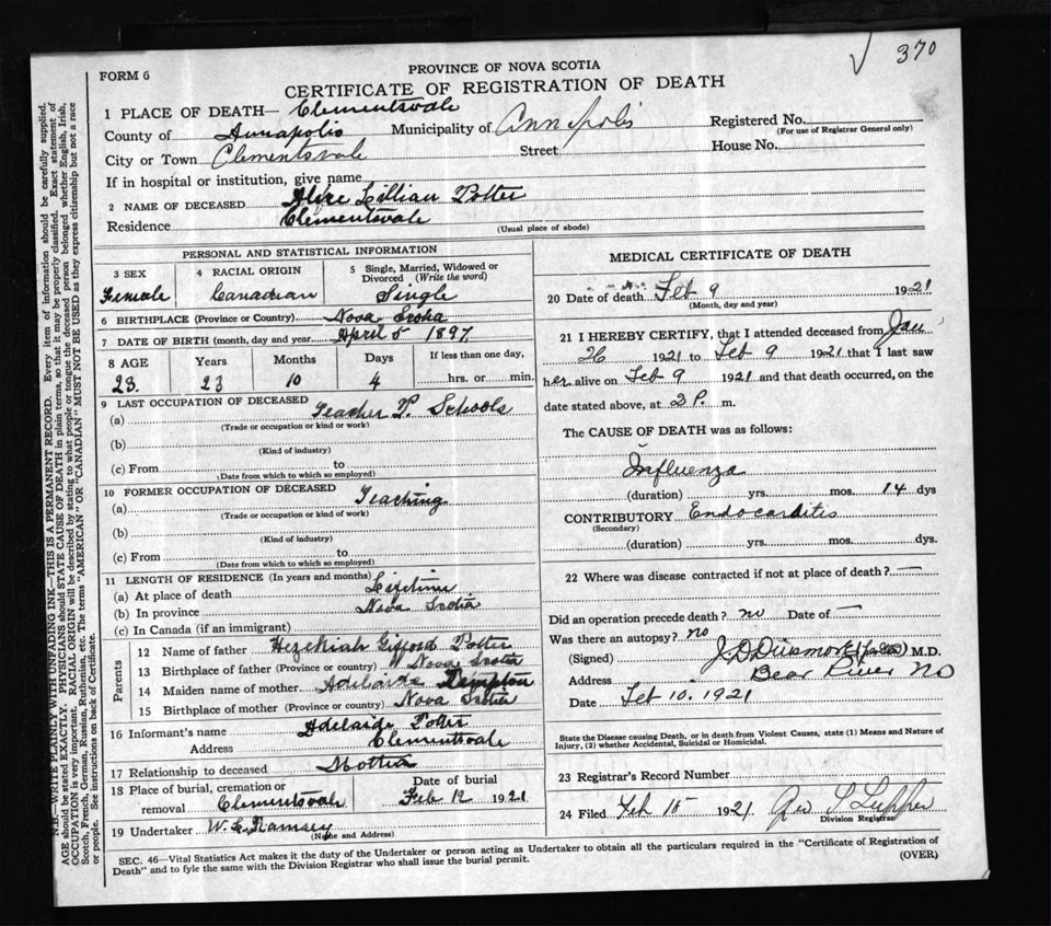 Female Death Registration: Year: 1921 file: 52 number: 370
