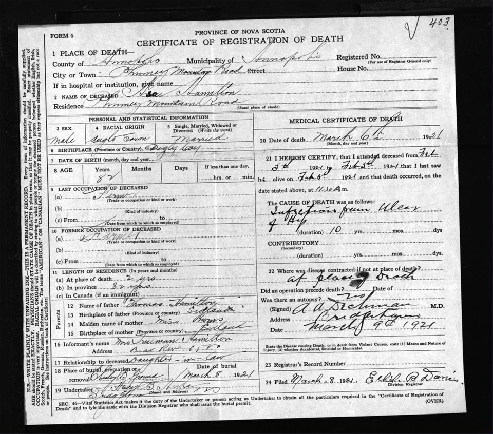 Male Death Registration: Year: 1921 file: 52 number: 403