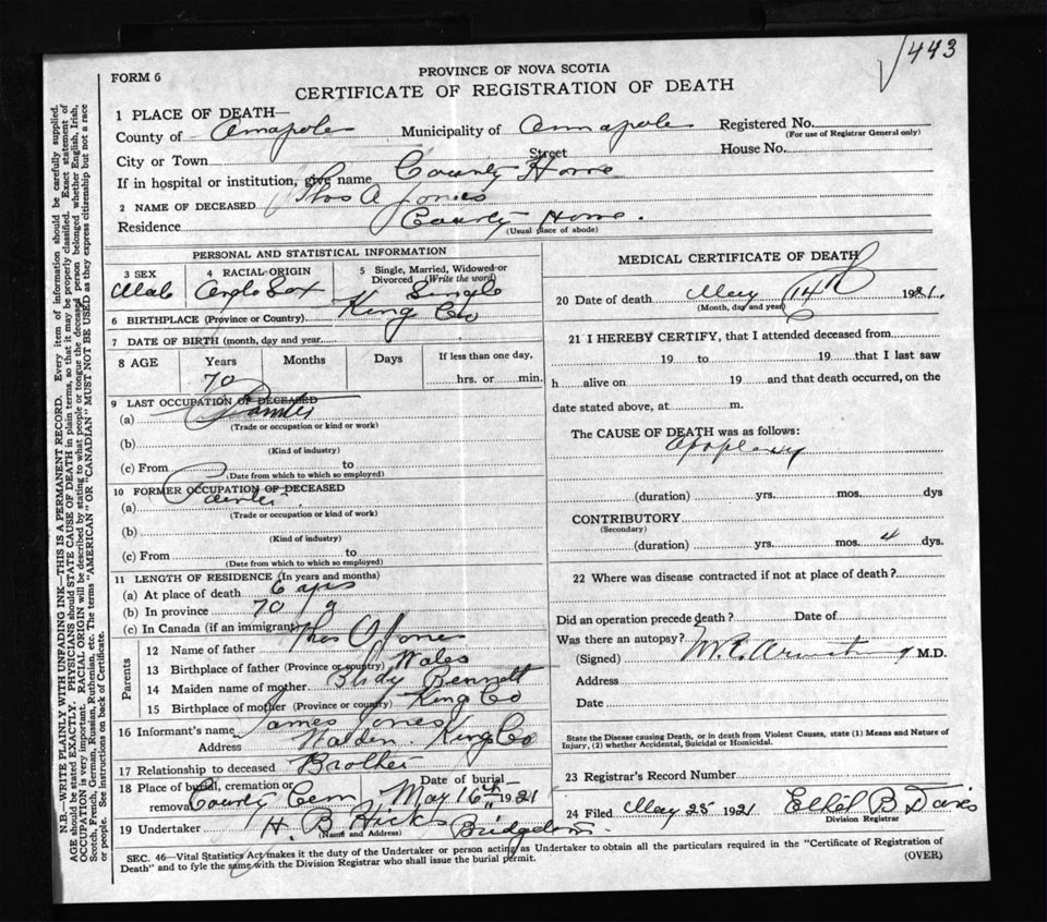 Male Death Registration: Year: 1921 file: 52 number: 443