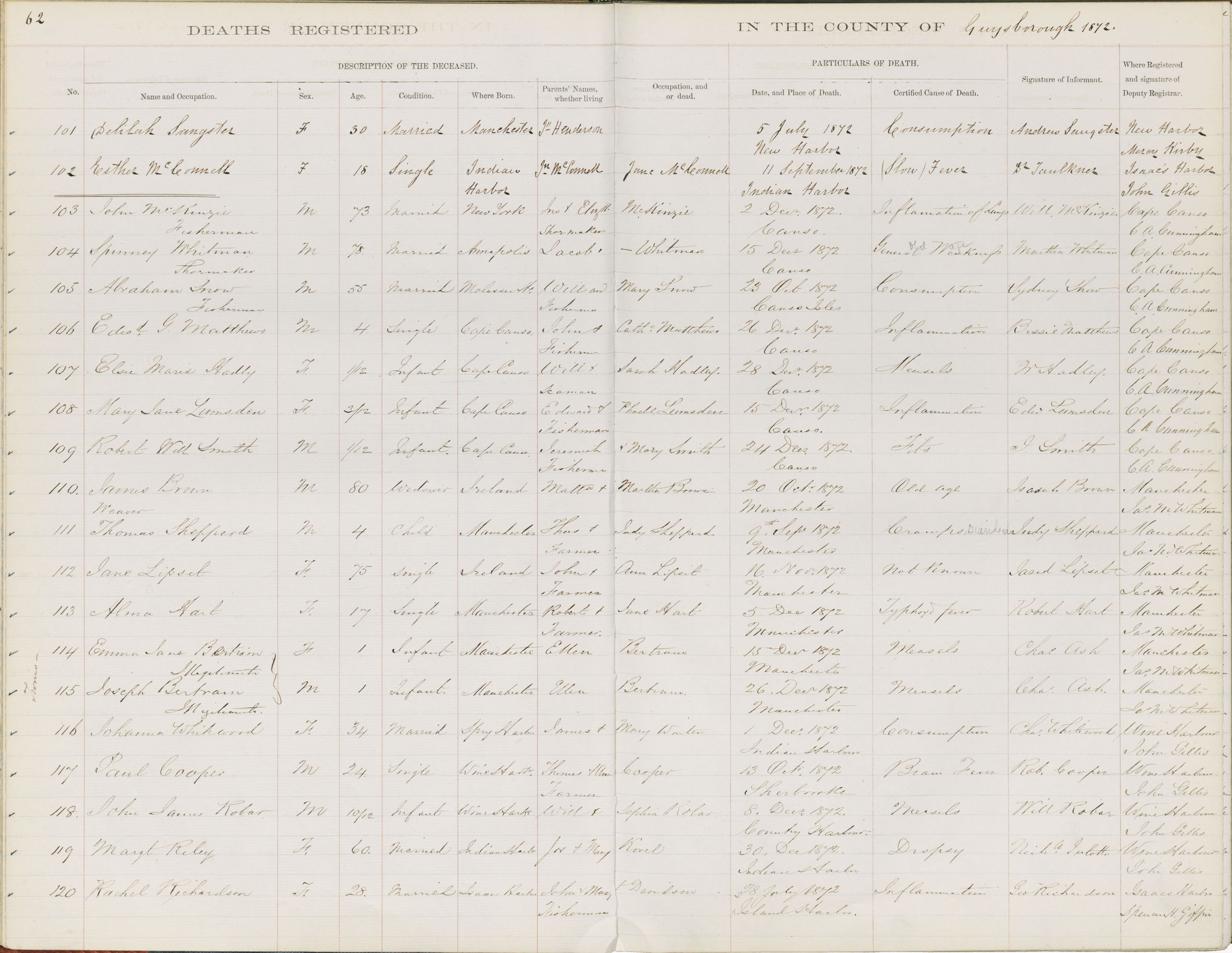 Death Registration: Year: 1872 book: 1807 page: 62 number: 120