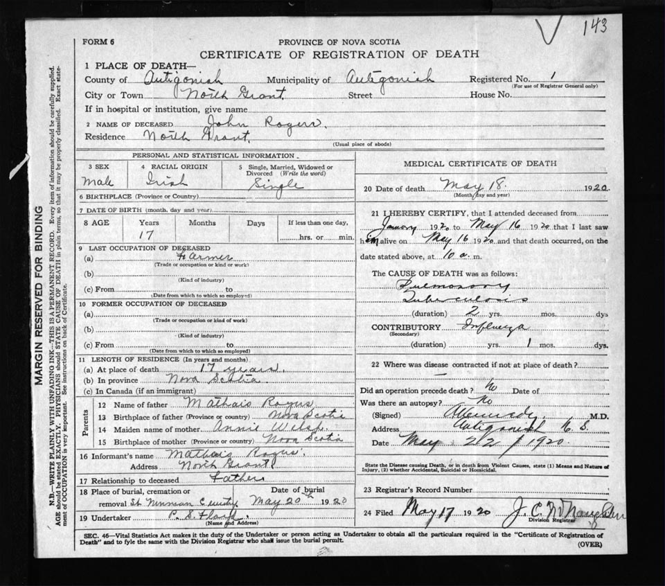 Male Death Registration: Year: 1920 file: 54 number: 143
