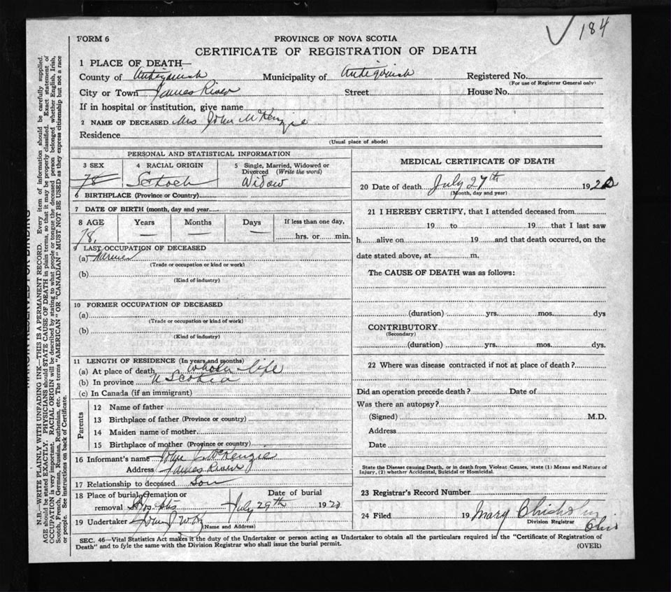 Death Registration: Year: 1920 file: 54 number: 184