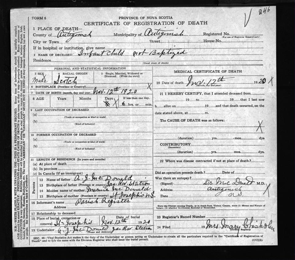 Male Death Registration: Year: 1920 file: 54 number: 246