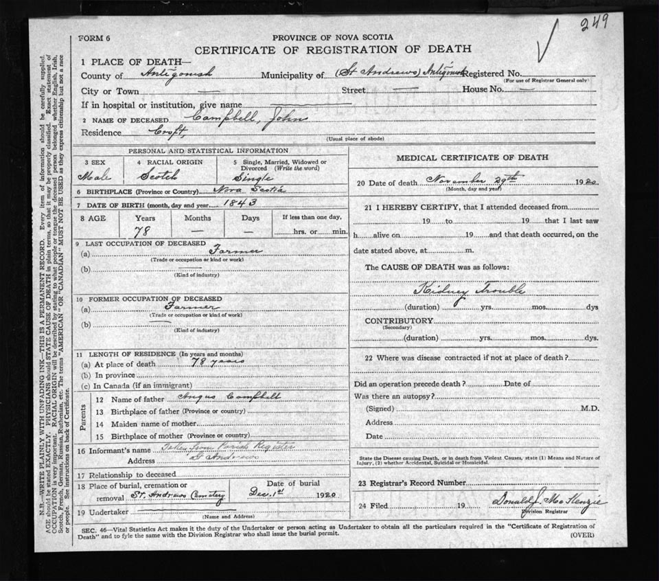 Male Death Registration: Year: 1920 file: 54 number: 249