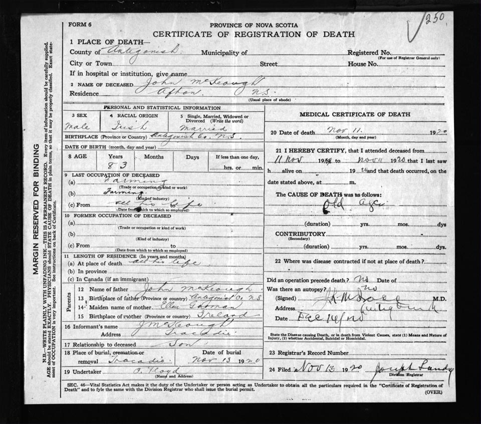 Male Death Registration: Year: 1920 file: 54 number: 250
