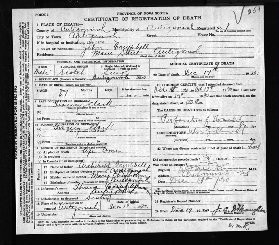 Male Death Registration: Year: 1920 file: 54 number: 254