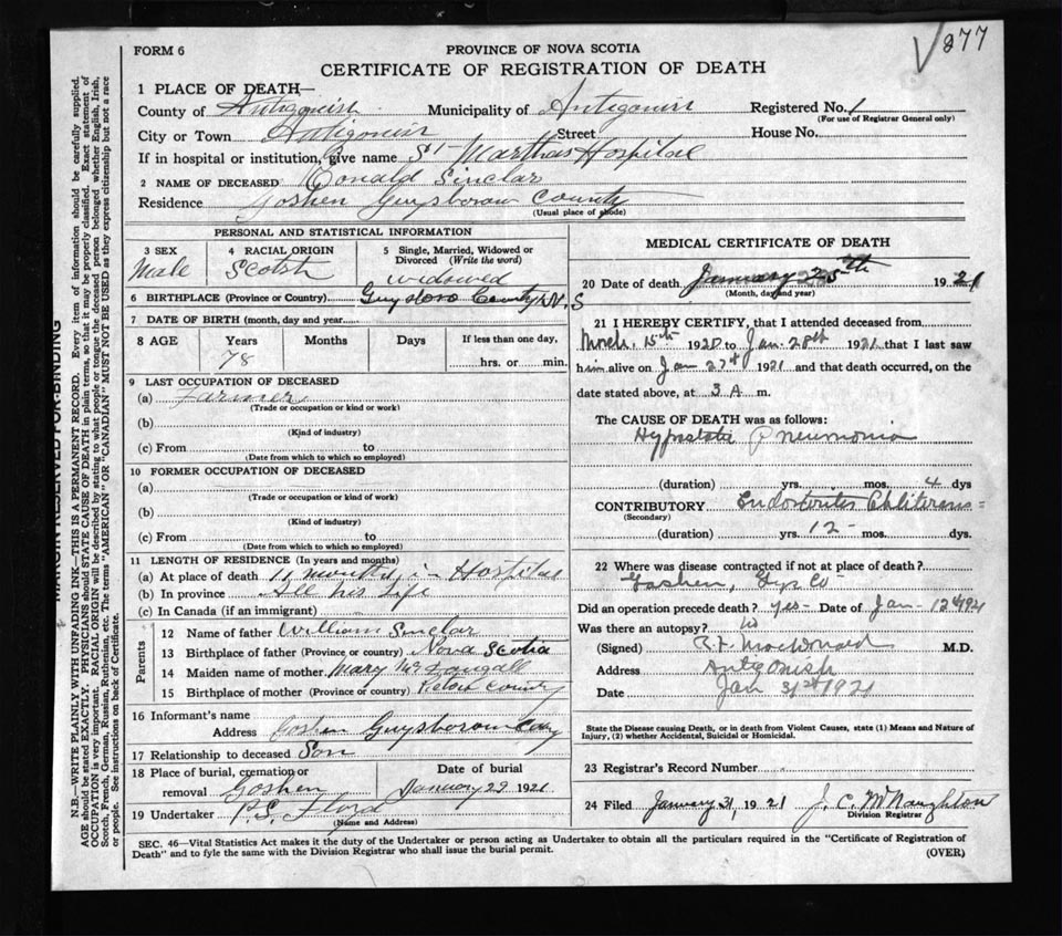 Male Death Registration: Year: 1921 file: 54 number: 277