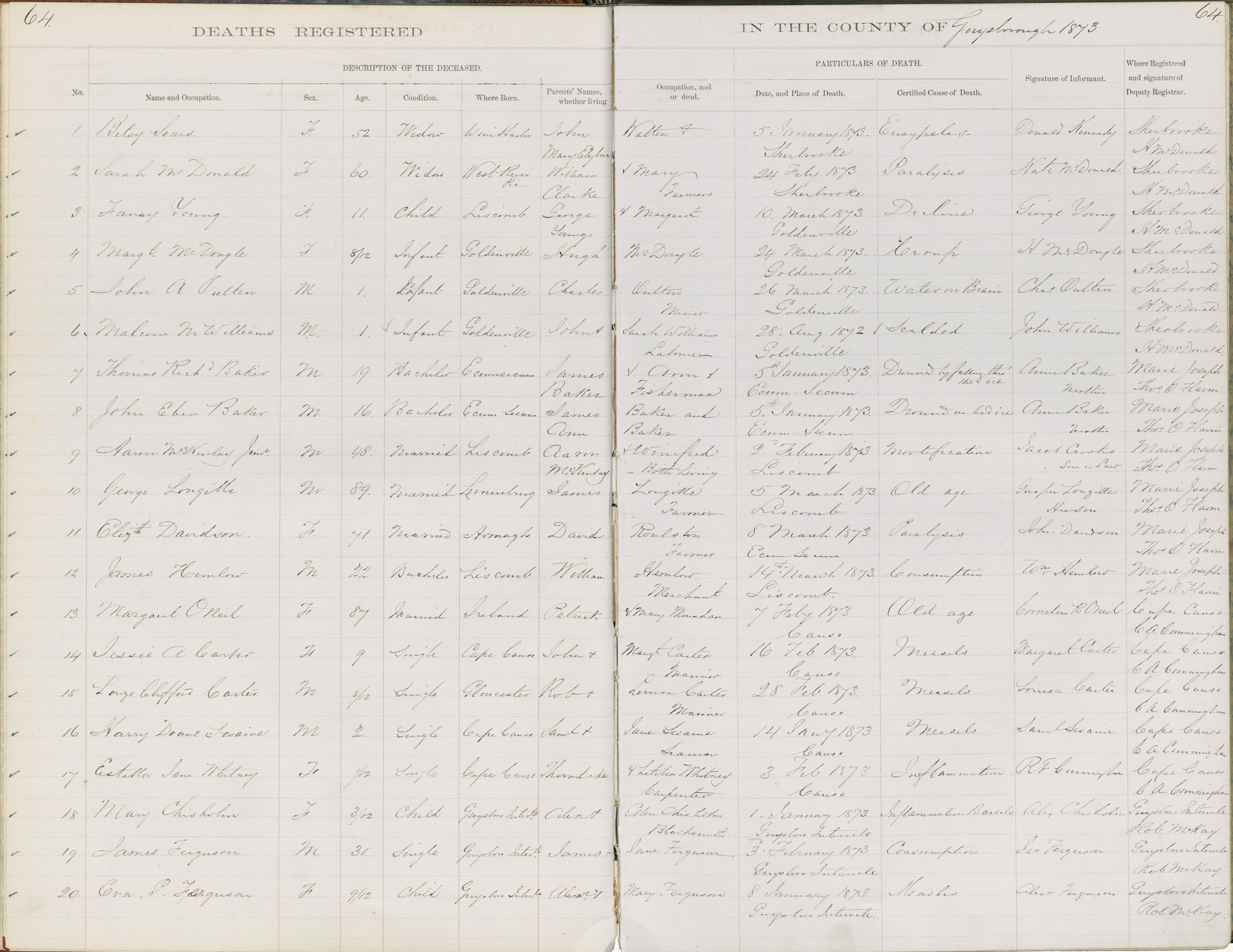 Death Registration: Year: 1873 book: 1807 page: 64 number: 20