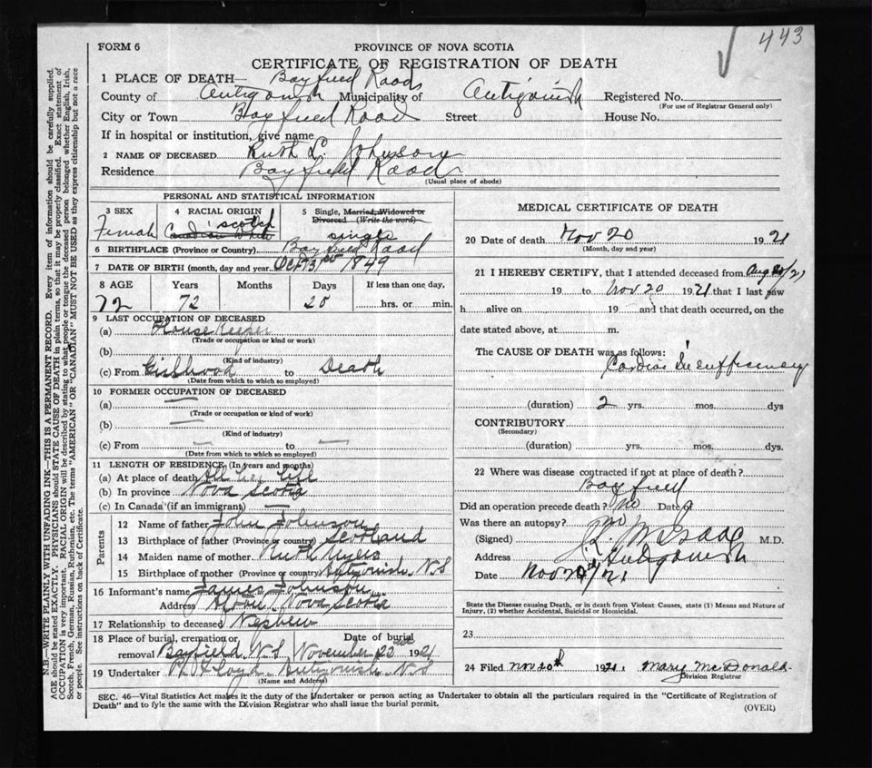 Female Death Registration: Year: 1921 file: 54 number: 443