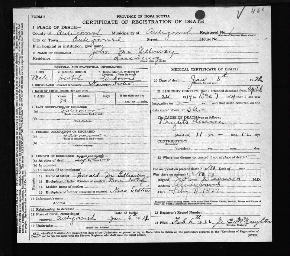 Male Death Registration: Year: 1922 file: 54 number: 460