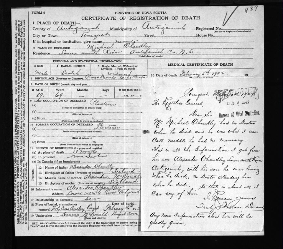 Male Death Registration: Year: 1922 file: 54 number: 489