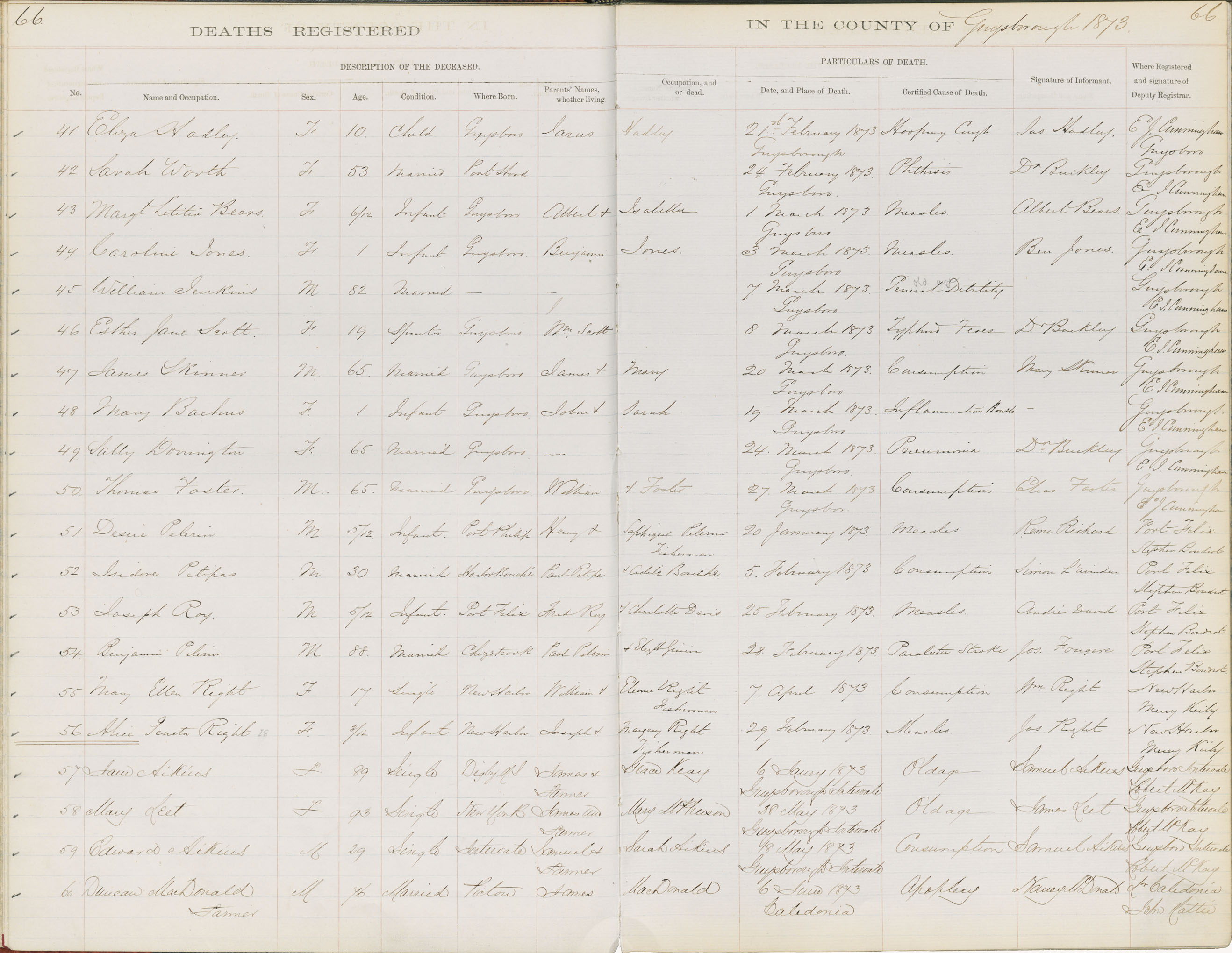 Death Registration: Year: 1873 book: 1807 page: 66 number: 60