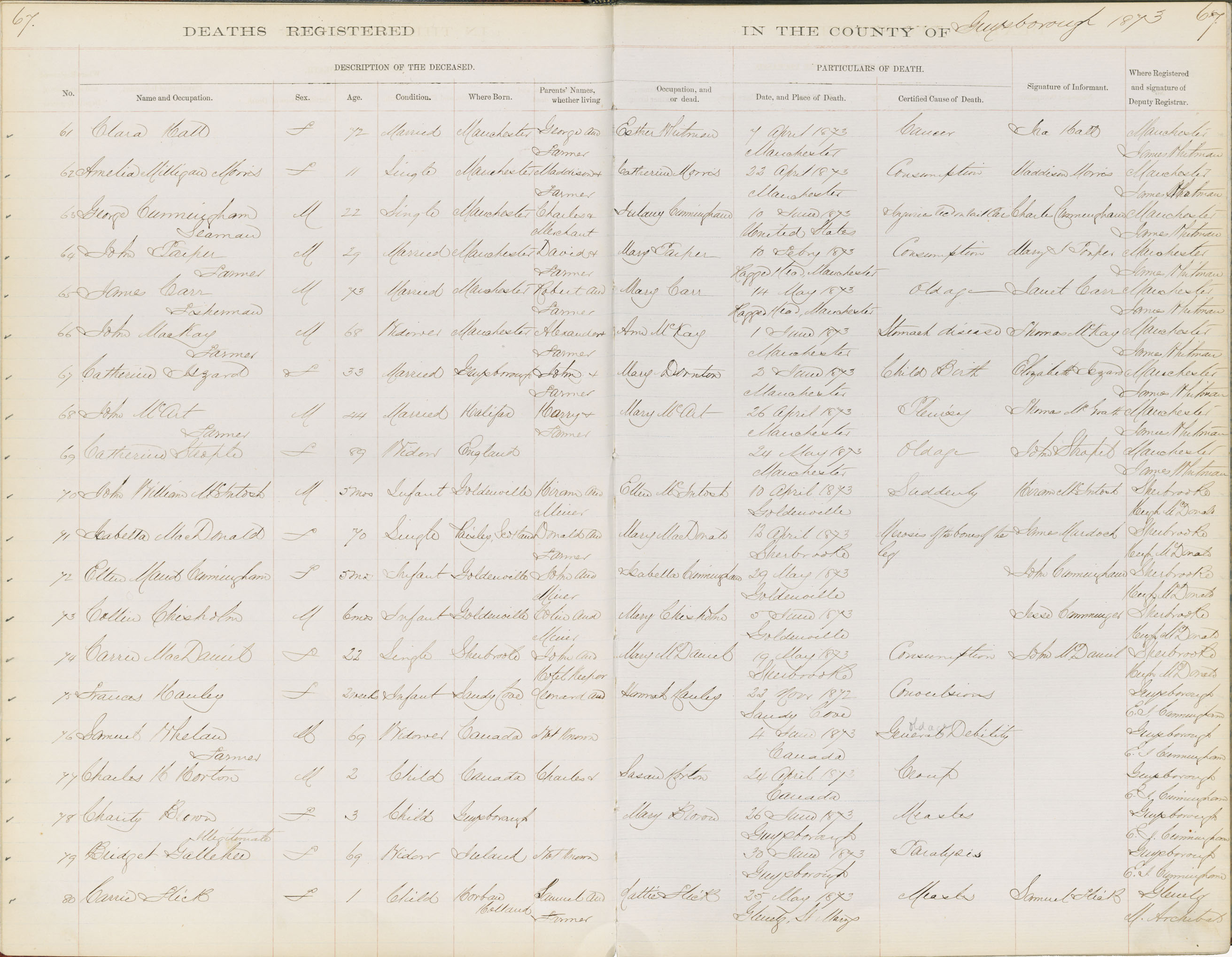Death Registration: Year: 1873 book: 1807 page: 67 number: 71