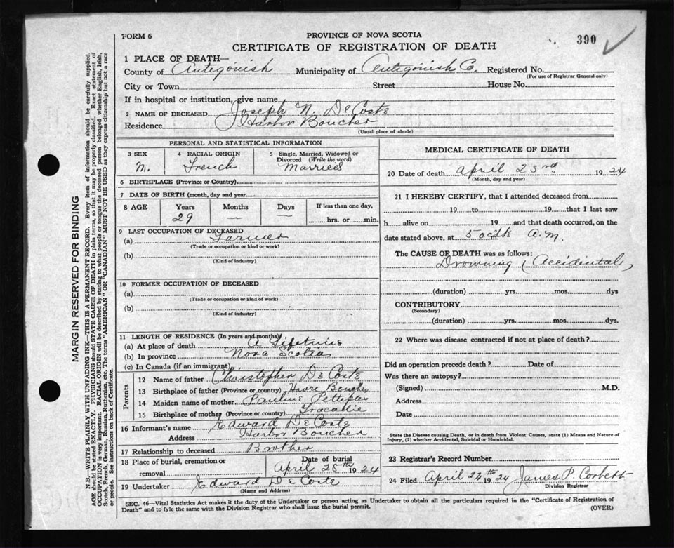 Male Death Registration: Year: 1924 file: 55 number: 390