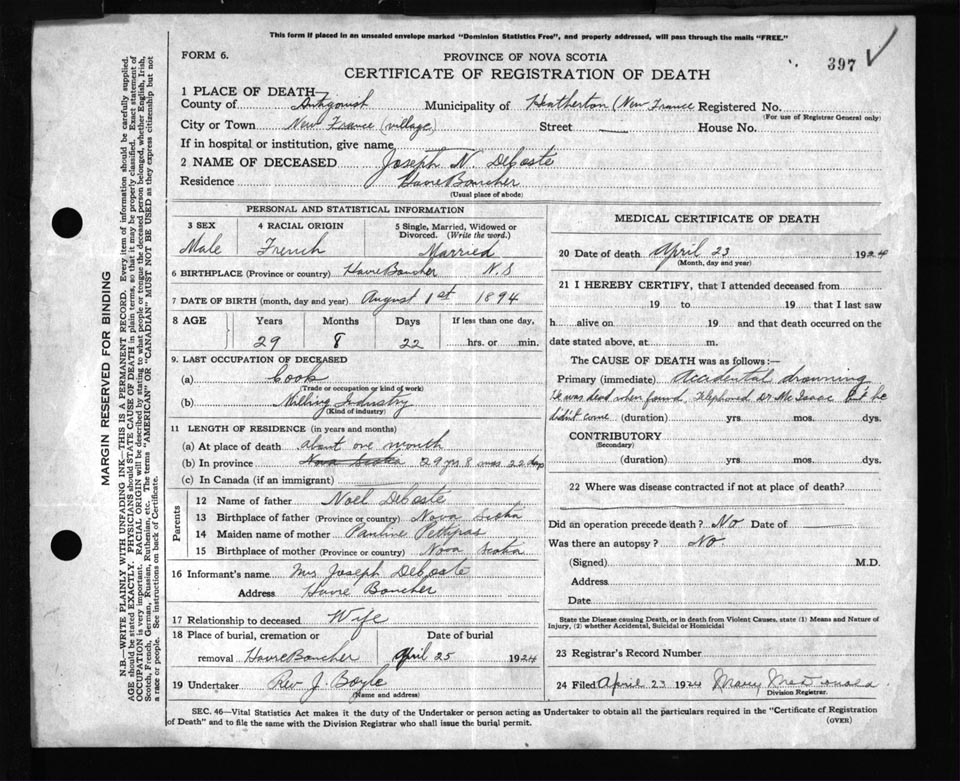 Male Death Registration: Year: 1924 file: 55 number: 397